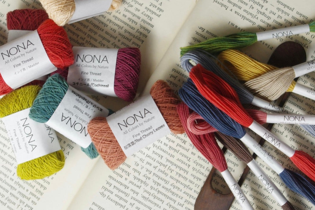 上の細糸は、NONA手まり糸の無染色糸。