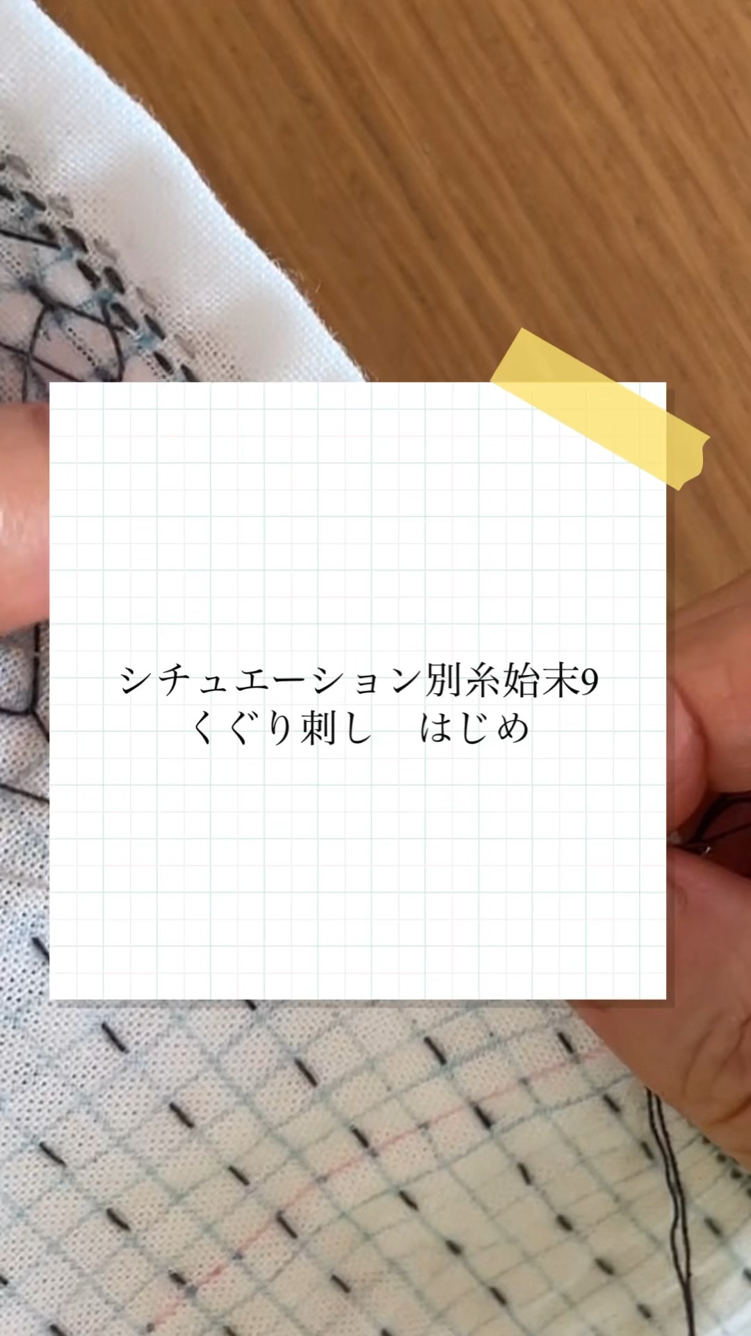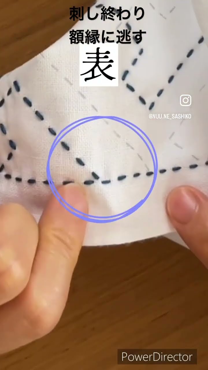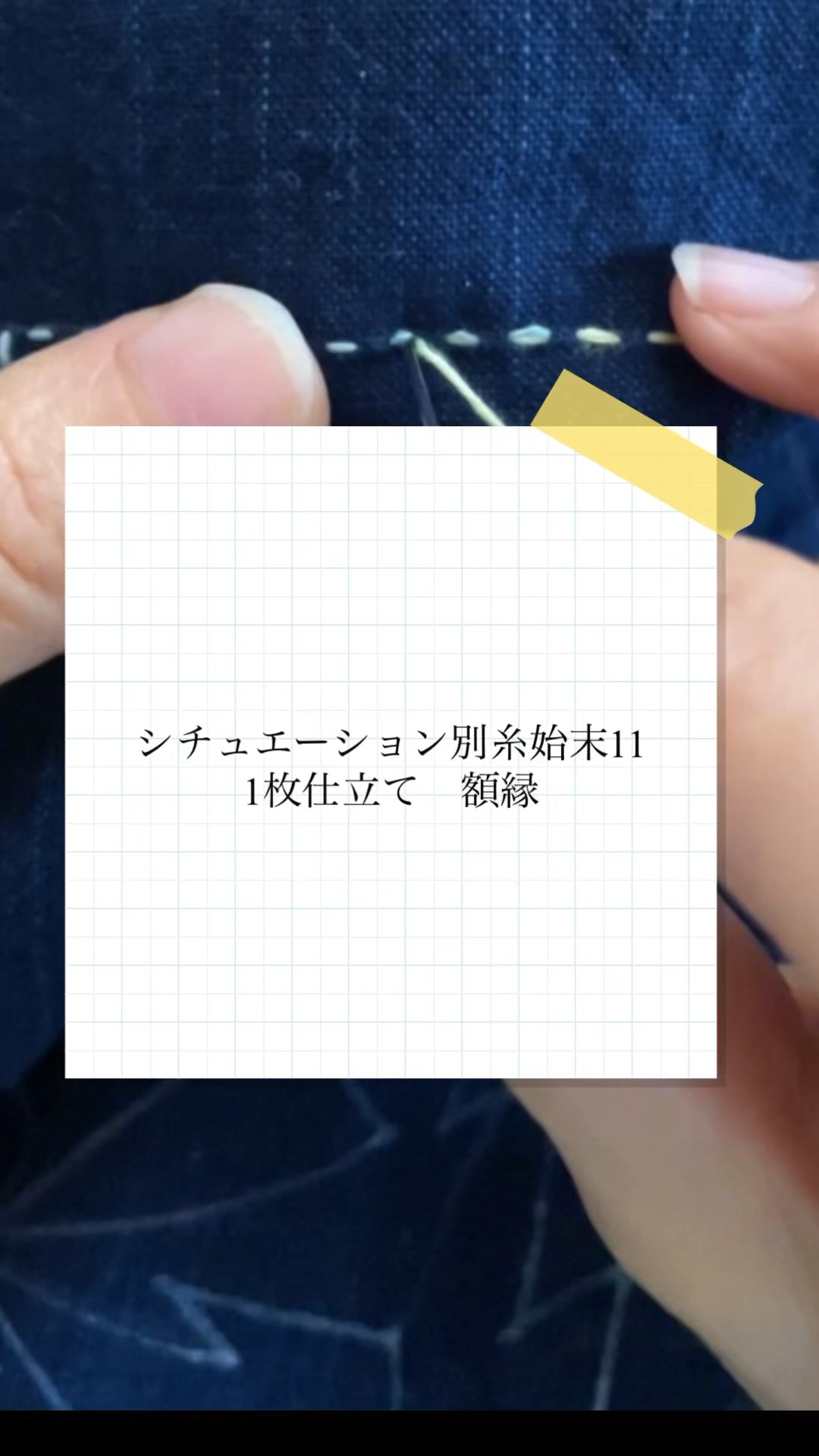 額縁と違う色で縫ってるー、とか、段染め糸で縫ってるー、っていう場合は一つ前のシチュエーション4のやり方で始末したほうが良いですね。動画は沙綾形(さやがた)。
