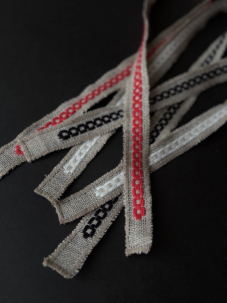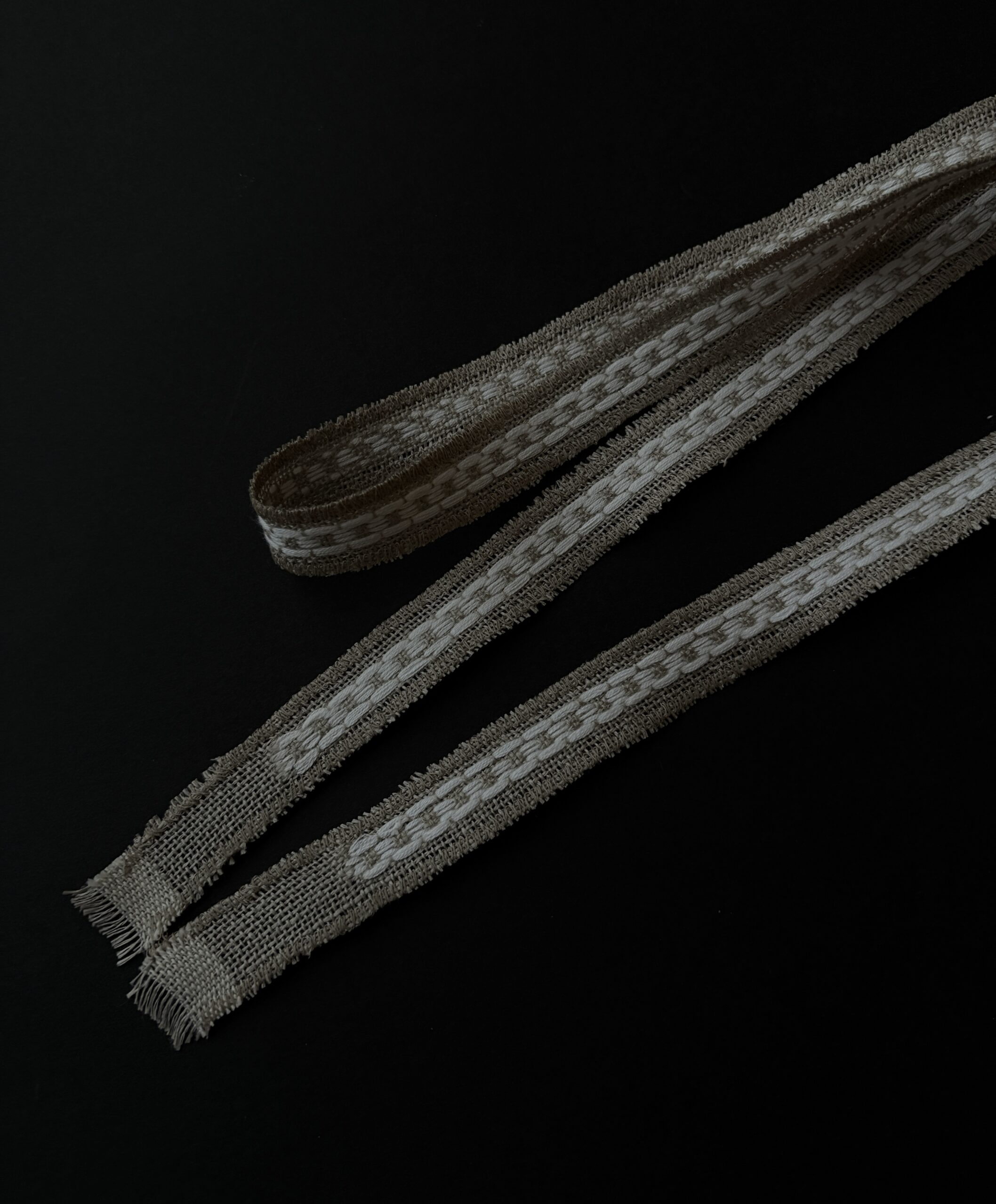 このリボンは、リネンの生地をあえて切りっぱなしで使い、端だけを整えています。